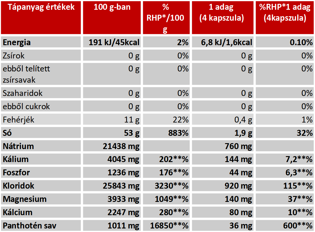 * Felnőttekre vonatkozó napi beviteli referencia érték (8,4000 kJ/2,000kcal) ** %-a a napi beviteli referencia értéknek Ajánlott napi mennyiség 4 kapszula A doboz 120 db kapszulát tartalmaz